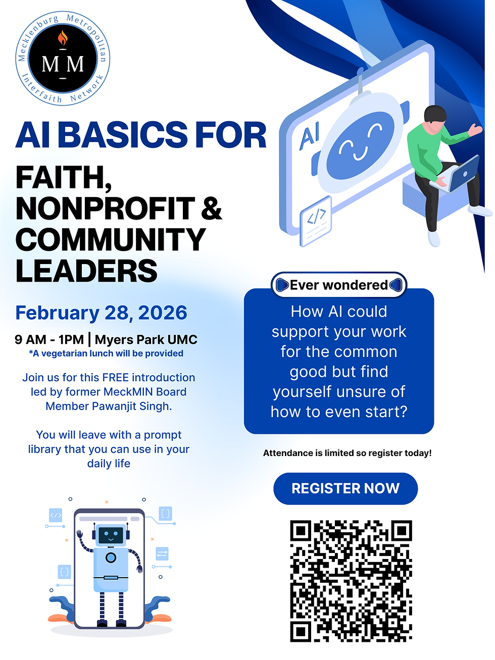 We have FOUR spaces open at our FREE AI Basics for Faith, Community and Nonprofit Leaders training this Saturday, February 28 from 9 am to 1 pm at MPUMC. This is a GREAT OPPORTUNITY. Similar trainings cost upwards of $1,500! The workshop is hands-on and aimed at beginners. We’ll have LOTS of volunteers on hand to help those of us who need extra support in getting started.